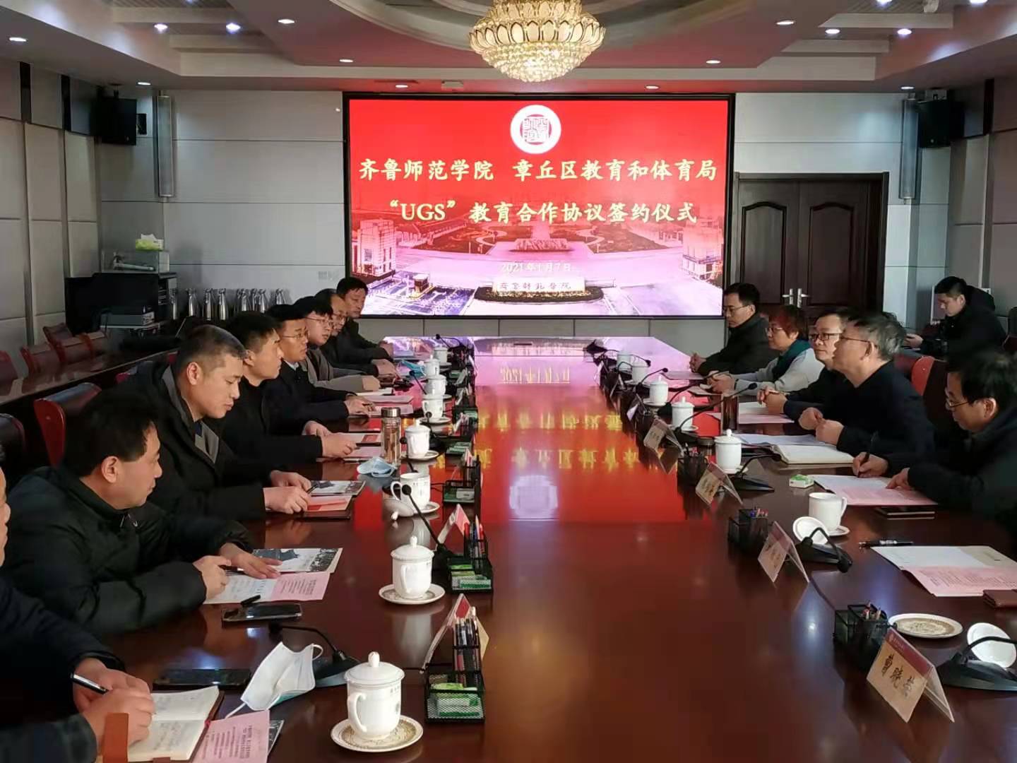 2020年1月7日下午,我校在图书馆四楼会议室举行齐鲁师范学院-章丘区教育和体育局“UGS”教育合作协议签约仪式。校党委副书记、校长林松柏,章丘区教育和体育局局长刘国兴、副局长张宝义应邀出席会议,章丘市教育和体育局相关部门负责同志和部分中小学校长,我校相关部门的负责同志和部分学院院长参加了签约仪式,签约仪式由教务处处长孙洪兆主持。
