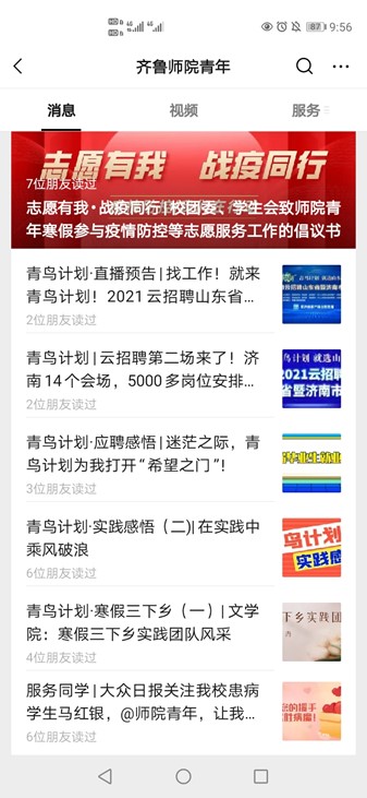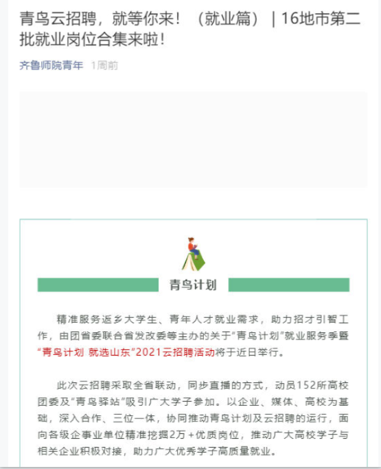 一、宣传动员到位,有序协调统筹推进。根据团省委统一部署,我校团委创新工作模式,成立青鸟计划交流专群,进行线上青鸟计划云招聘经验交流及工作部署,专门的老师负责青鸟计划工作,压实责任到人;云招聘期间,通过“齐鲁师院青年”官方微信平台发布青鸟计划相关微信35篇,面向所有师院青年广泛宣传青鸟计划,动员学生参与青鸟计划云招聘活动;为确保各二级学院有效动员落实,校团委还与各学院团总支书记进行一对一沟通对接,强调服务学生就业的重要性、必要性,强化二级学院团委责任意识。