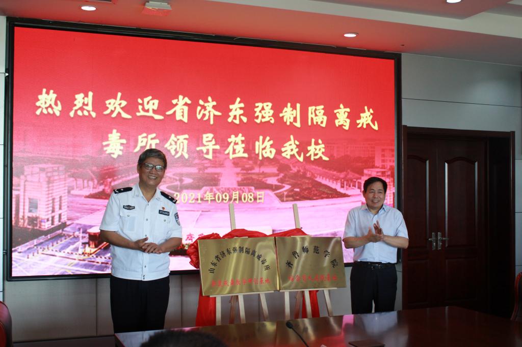9月8日上午,我校与山东省济东强制隔离戒毒所警校结对共建签订仪式和“山东省济东强制隔离戒毒所非遗戒毒研创基地”挂牌仪式在图书馆四楼会议室举行。校党委副书记刘宝君和山东省济东强制隔离戒毒所党委副书记、政委张凯代表双方授牌,校团委书记孔庆松主持会议。济东所教育中心主任孙丰标,心理矫治中心主任彭子荣,政治处副主任郭大威,康复训练中心等一行10余人莅临我校,保卫工作部副部长韩玉柱,各学院团总支书记、辅导员代表,马克思主义学院教师刘金玲副教授,学生代表参加了签约、揭牌仪式。