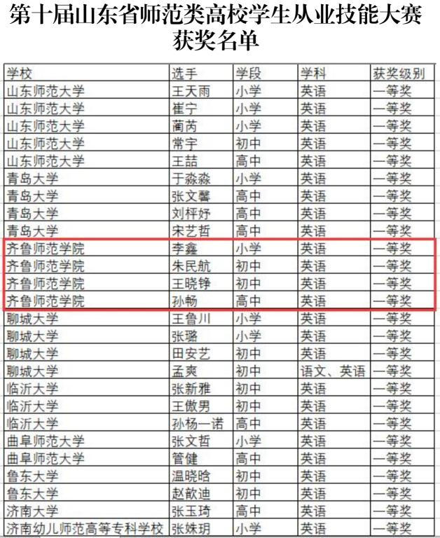 本次比赛中,英语学科设有小学、初中、高中三个学段。我校英语学科共有4名推荐选手,首次有一专多能选手获得推荐名额,抽选选手八进七,共11人进入山东省决赛,选手数量和类别创学院历史新高。4名选手获得一等奖,2名选手获得二等奖,4名选手获得三等奖,在参赛高校英语学科中获一等奖数量与青岛大学并列第二。其中王晓铮获得初中英语推荐组一等奖第一名,外国语学院教师牛荦、董苗苗、高颖、汪洁获得“优秀辅导教师”荣誉称号。