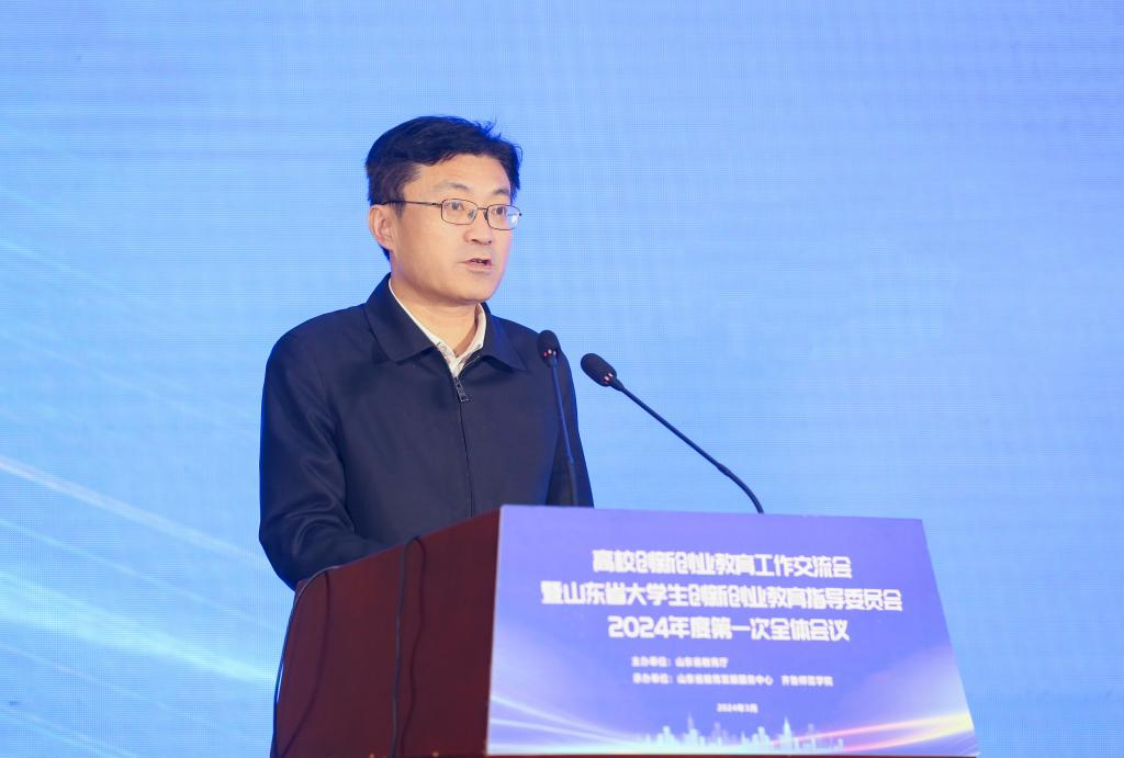 王浩进行会议致辞,他代表山东省教育厅对会议的成功举办表示热烈祝贺,向各位嘉宾表示诚挚欢迎,向长期以来关心支持山东教育事业特别是高校创新创业教育工作的各位朋友们表示衷心感谢。他总结了2023年我省高校创新创业工作取得的新成效、新突破,表示创新创业教育是学生创新创业的基础,是培养创新人才、服务创新驱动发展战略、促进高校毕业生更高质量创业就业的重要举措。各高校要坚持创新引领创业、创业带动就业,深化创新创业教育改革,提高创新人才培养质量,通过完善创新创业教育机制、完善创新创业教学体系、强化创新创业实践锻炼、做好创新创业指导服务四个层面,落实我省创新发展“十大行动”部署,切实加强对学生的创新创业教育,为教育强省建设提供源源不断的人才智力支撑。