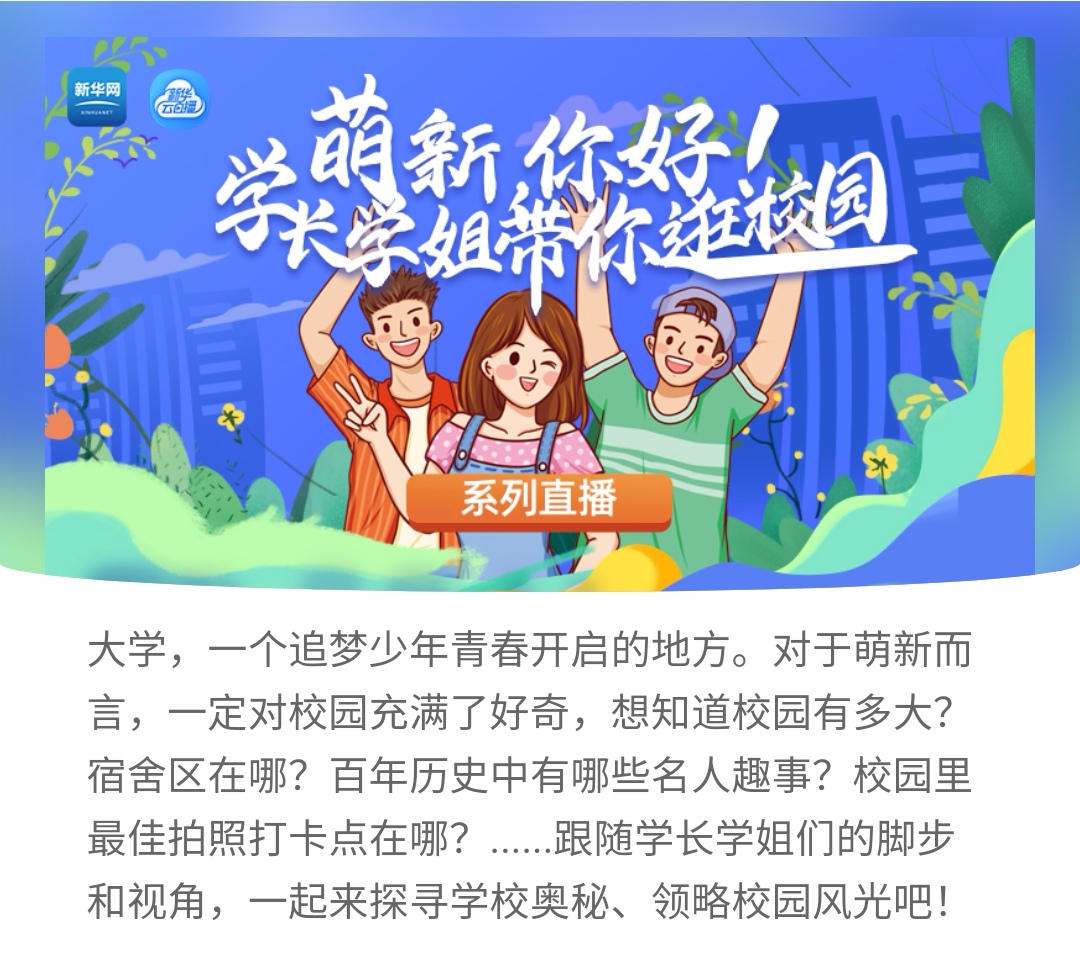 慕齐风鲁韵,承师风浩然。7月21日下午,我校与新华网联合推出的“萌新你好|‘云’逛齐鲁师范学院”活动顺利进行。该活动是新华网“萌新你好|学长学姐带你逛校园”系列直播活动之一,以“直播+录播”的形式在新华网首页播出,通过学长学姐视角,带领萌新们提前探寻学校奥秘、领略校园风光,目前播出10期,我校作为走进山东高校的第二站,以74.8万人次播放量创10期之最。