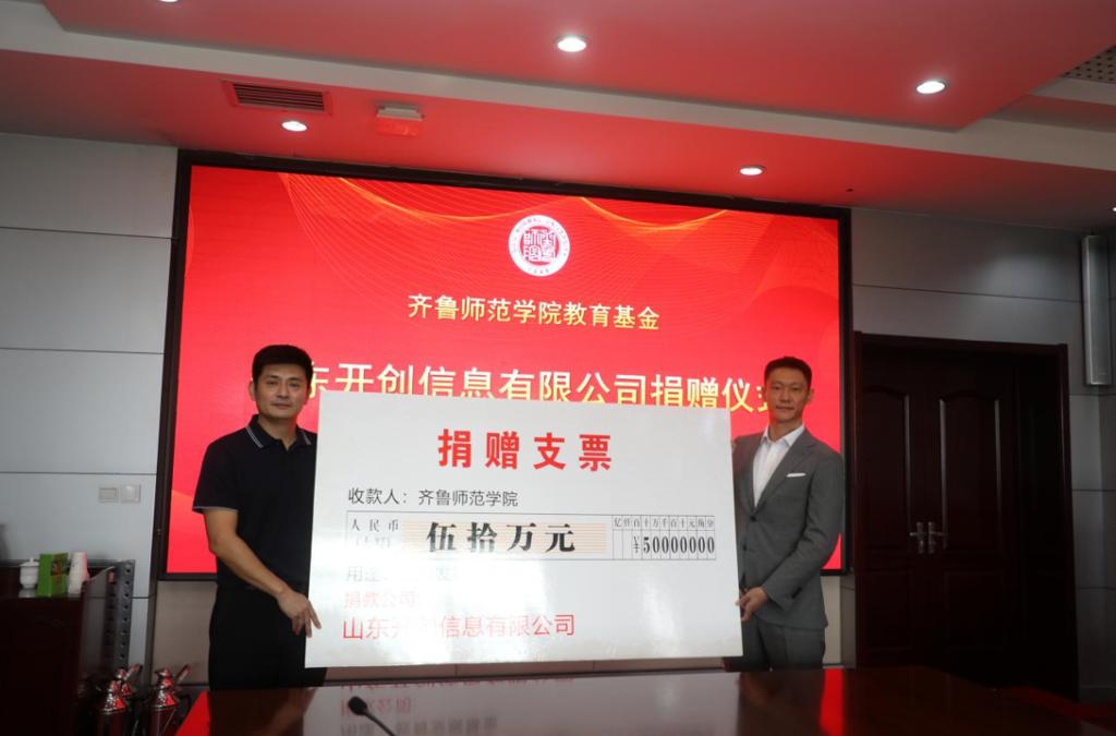 9月15日上午,我校在图书馆四楼会议室举行山东开创信息有限公司向齐鲁师范学院教育基金会捐赠暨智慧金融现代产业学院揭牌仪式,山东开创信息有限公司向我校教育发展基金捐赠50万元。