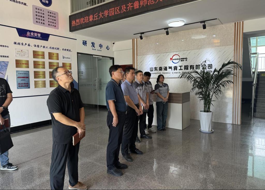 为全面贯彻落实党的二十届三中全会精神,推动科技创新与创业创新深度融合,8月30日,齐鲁师范学院合作发展办公室主任刘勇一行赴山东南海气囊工程有限公司(以下简称“南海气囊”)对接合作。章丘区大学园区管理服务中心主任刘在明、副主任高震,南海气囊总经理段尚言、副总经理赵殿华,化学与化工学院杨冰川教授、陈俊勇副教授及相关工作人员参加会议。