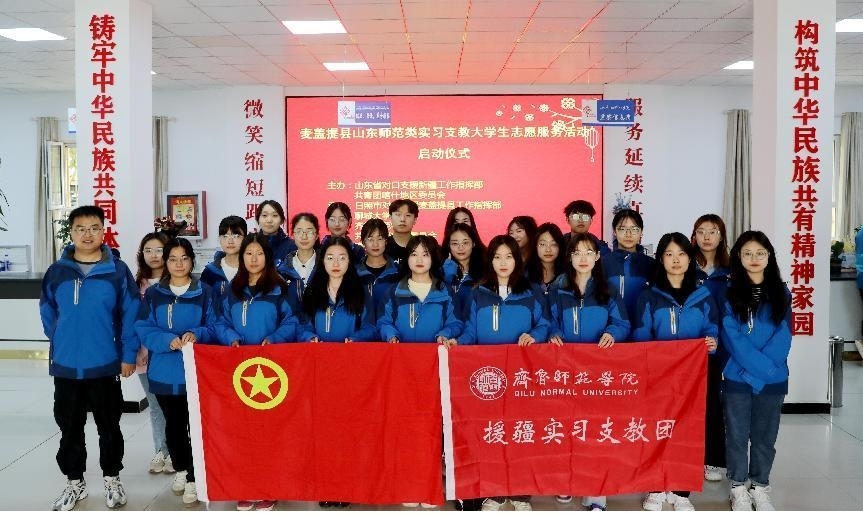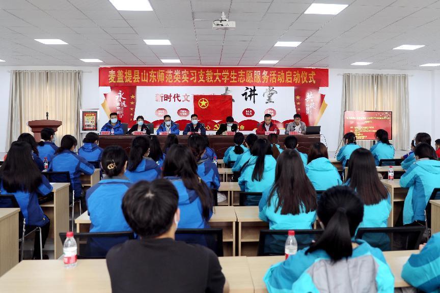 5月21日,麦盖提县山东师范类实习支教大学生志愿服务活动启动仪式在麦盖提县城南社区举行,日照市援疆指挥部、麦盖提团县委、县教育局等相关负责人出席,我校援疆实习支教学生代表、聊城大学学生代表和城南社区红领巾小课堂学生等80人参加仪式。