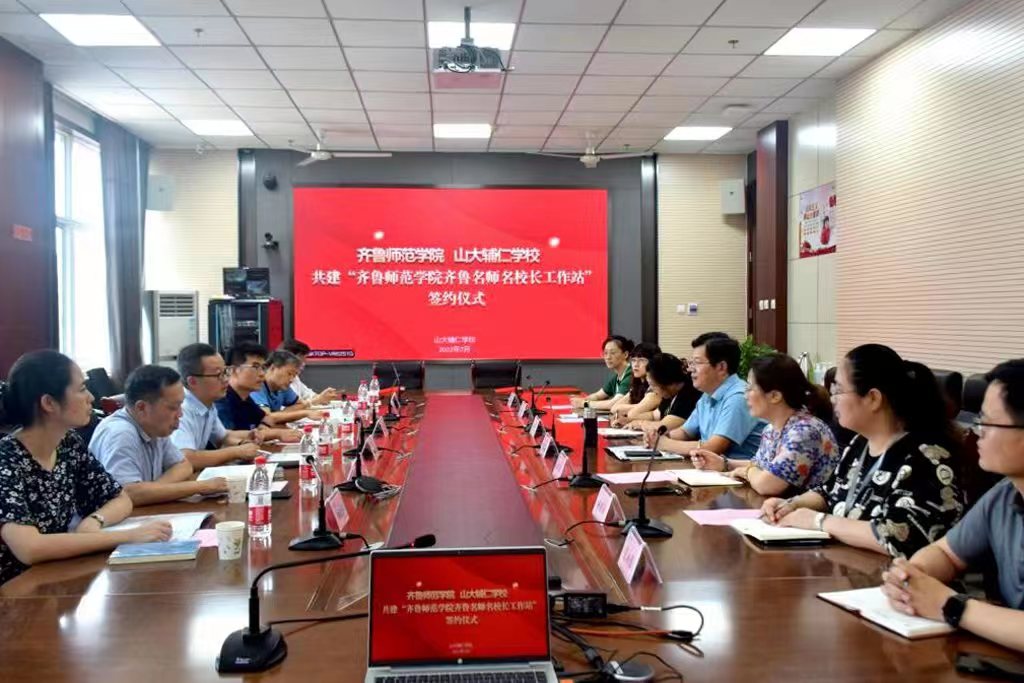 签约仪式上,郑廷伟介绍了山大辅仁学校的基本情况,学校在人才培养、教育教学、教学研究及课程资源开发等方面的成绩,希望我校专家经常进校指导,在教学研究方面、师资互聘及到双方挂职锻炼等方面加强合作。孙洪兆介绍了齐鲁师范学院的基本情况,说明共建齐鲁名师名校长工作站的意义,希望以此为契机,加深与山大辅仁学校的合作交流。
