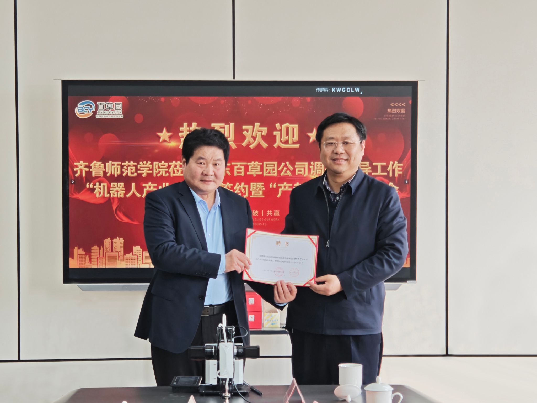 郑秀文感谢学校1991级校友郭方华对母校的感恩与反馈,感谢百草园股份公司对齐鲁师范学院的支持与认可。他介绍了学校发展历程和优势学科建设情况以及师范性、地方性、应用型的发展定位。郑秀文指出,机器人作为新兴技术的重要载体和现代产业的关键装备,引领产业数字化发展、智能化升级,不断孕育新产业新模式新业态,齐鲁师范学院设有“机器人工程”专业,在机器人制造、智能制造、人工智能、航空航天等领域积累了众多科研成果,“机器人产业学院”的建立将给校企双方带来新的发展机遇。希望校企双方本着“资源共享、平台共建、人才共育、共同发展”原则,通过技术创新与产学研合作,打通企业技术需求与高校科技人才的对接通道,促进学校聚焦行业关键技术问题、提高相关科研成果转化率,吸引和培养高层次创新创业人才,实现技术创新和产业化发展的互促式发展。