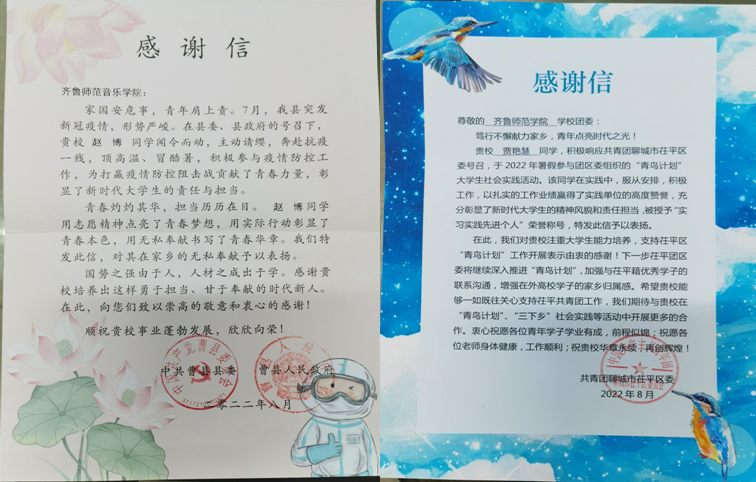 近日,我校音乐学院接连收到两封感谢信,一封是来自山东省菏泽市曹县人民政府的感谢信,感谢2021级音乐学三班赵博同学在暑假期间积极参与当地疫情防控志愿服务,为打赢疫情防控阻击战贡献了青春力量。另一封是来自共青团聊城市茌平区委的感谢信,感谢2021级音乐学三班贾艳慧同学在暑期积极参加“返家乡”社会实践,与当地干部共同奋斗在脱贫攻坚战第一线,得到了实践单位的肯定和表扬。