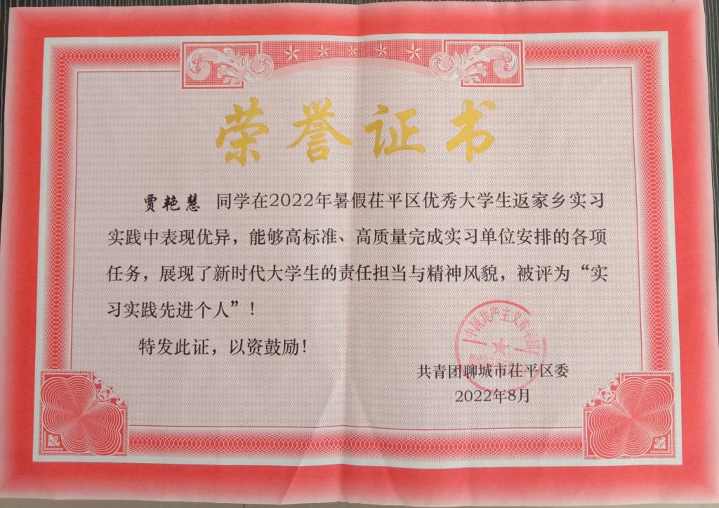 贾艳慧同学在2022年暑假期间积极响应号召,参加“青鸟计划”大学生社会实践活动,在实践中服从安排,积极工作,以扎实的工作业绩赢得了实践单位的高度赞誉,充分彰显了新时代大学生良好的精神风貌和责任担当,被授予“实习实践先进个人”荣誉称号。