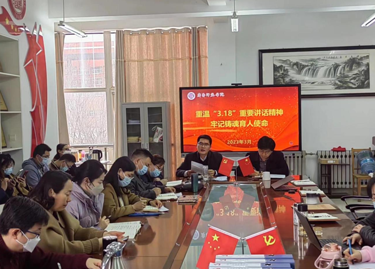 3月16日,在全国两会闭幕和习近平总书记“3.18”重要讲话发表四周年之际,马克思主义学院在章丘校区召开全体教师会议,集体学习两会精神,重温“3.18”重要讲话精神,牢记铸魂育人使命,切实提升业务能力,深入落实立德树人根本任务。会议由马克思主义学院院长赵立峰教授主持。