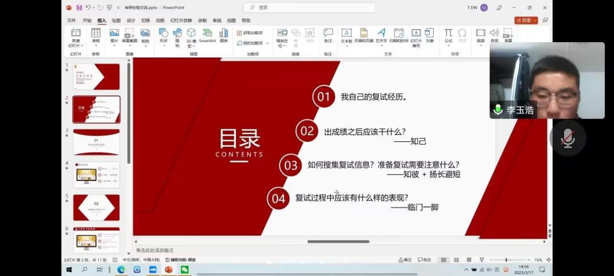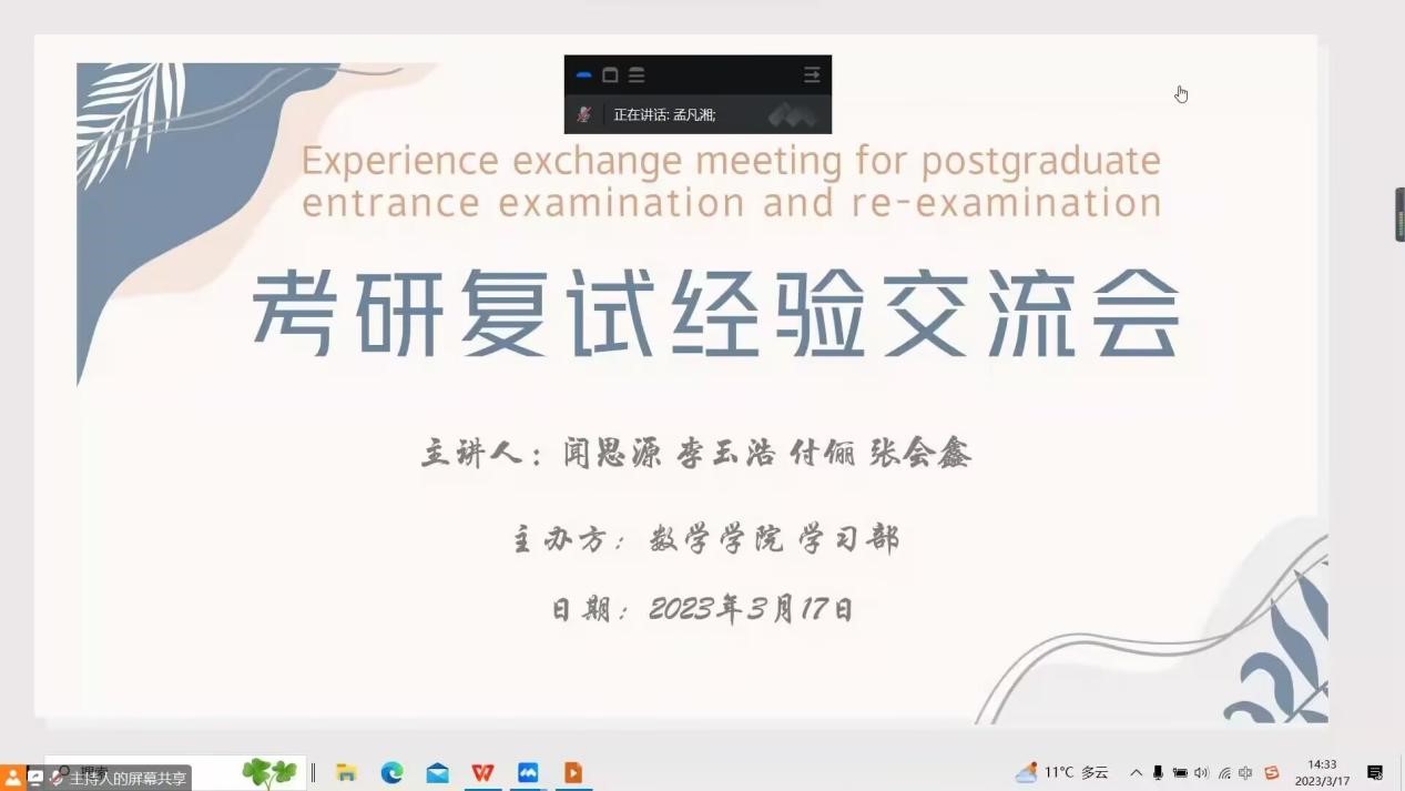 为更好帮助2023届考研学子顺利上岸,数学学院于3月17日下午召开线上考研复试经验交流会。本次交流会邀请到2018级四位优秀考研代表作经验分享,2019级全体初试过线的同学参加交流会。