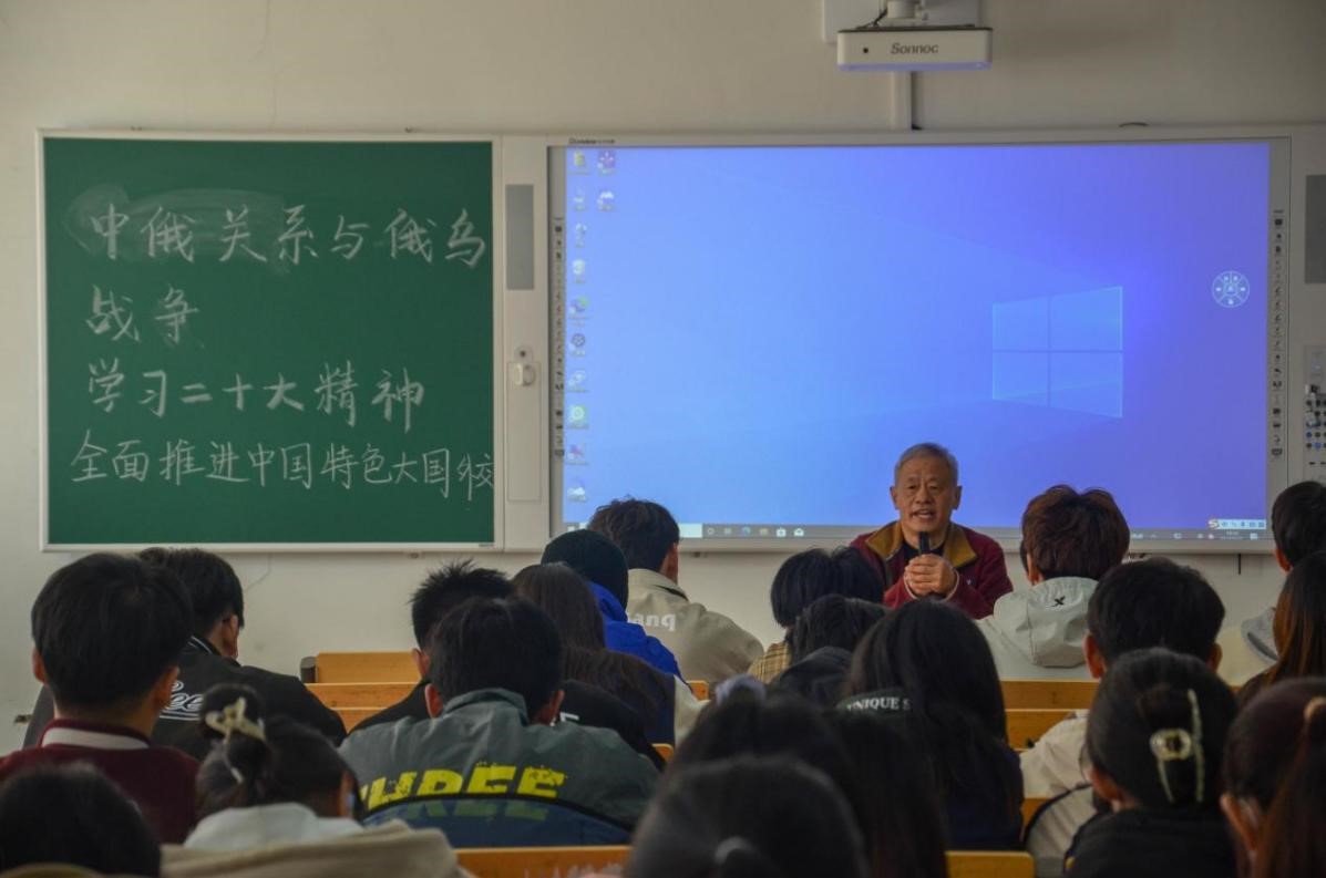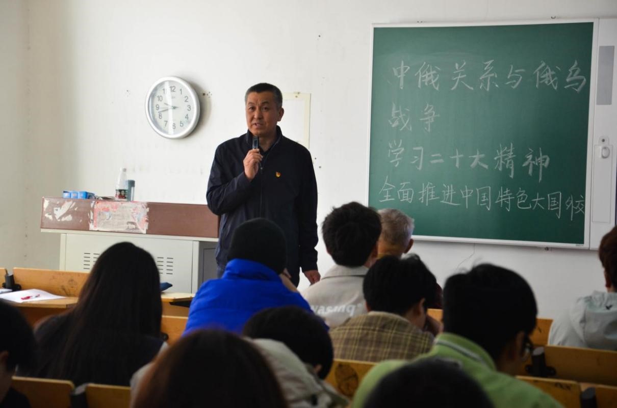 为多措并举持续推进党的二十大精神落地生根,引导广大党员师生把党的先进理论学深悟透,3月23日下午,物理与电子工程学院邀请宋继和教授做了题为《中俄关系与俄乌战争---学习党的二十大精神全面推进中国特色大国外交》的报告,开展“学习党的二十大精神,全面推进中国特色大国外交”主题党日活动,报告会由学院党委书记陈宝金主持,全院师生党员及入党积极分子参加。