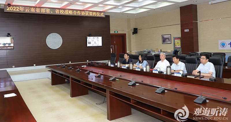 本站讯6月29日,云南省部省、省校战略合作协议签约仪式在北京举行,教育部部长怀进鹏、副部长孙尧,云南省省长王予波、副省长张治礼出席仪式;27所高校相聚云端,共谋合作发展。中国海洋大学校长于志刚、副校长王剑敏、校长助理周珊珊在崂山校区分会场参加仪式,于志刚代表学校与云南省政府签订了省校战略合作协议。