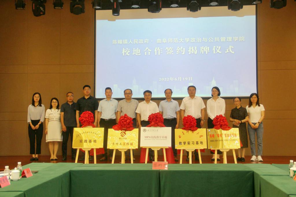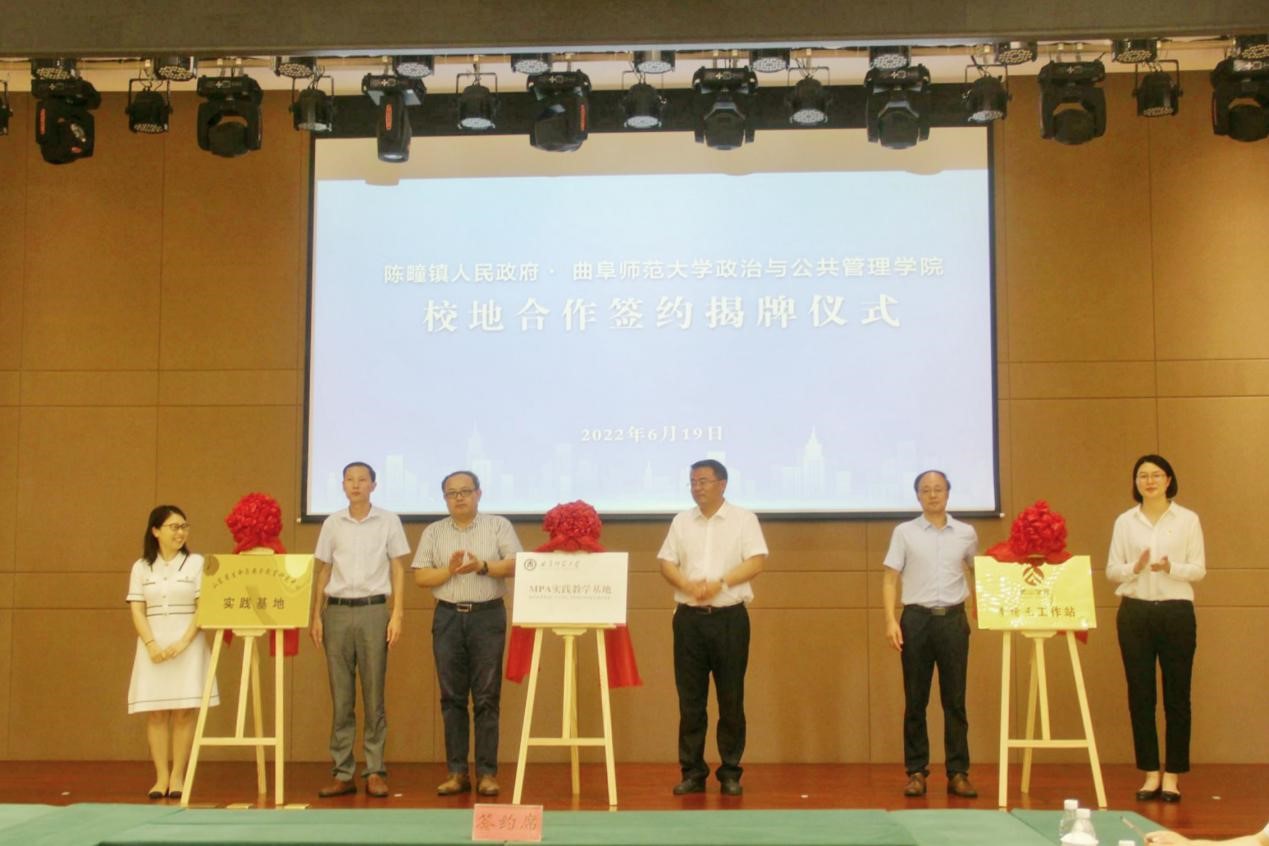 张忠凯与李满升为“曲阜师范大学教学实习基地”、“陈疃‘镇校’智库共同体”揭牌;林士俊与刘兴华为“曲阜师范大学MPA实践教学基地”揭牌;李增元与李珊珊为“泰山学者李增元工作站”揭牌;曲阜师范大学山东省生命与安全教育研究中心宣教部主任陈学宁与王超为“山东省生命与安全教育研究中心实践基地”揭牌。