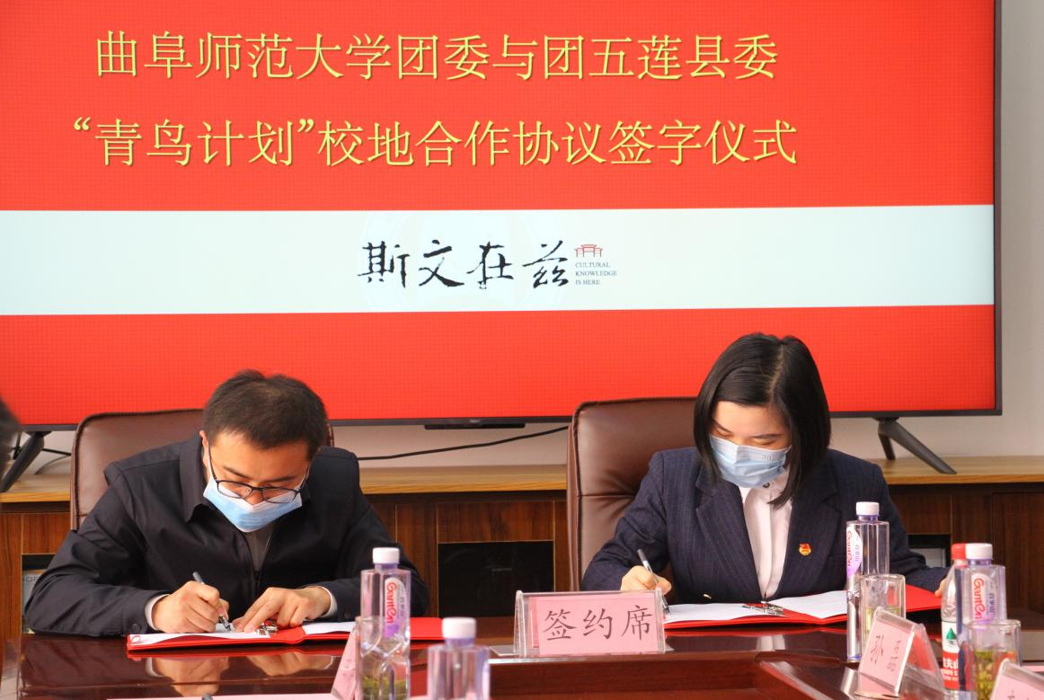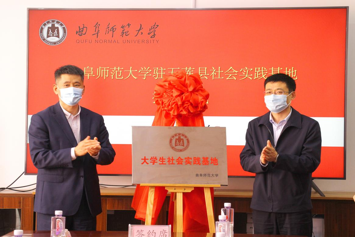 仪式上,校团委书记孔轶众与团五莲县委书记刘畅签署“青鸟计划”校地合作协议书,日照校区党委书记孔令军、五莲县委副书记王军为曲阜师范大学驻五莲大学生社会实践基地揭牌。