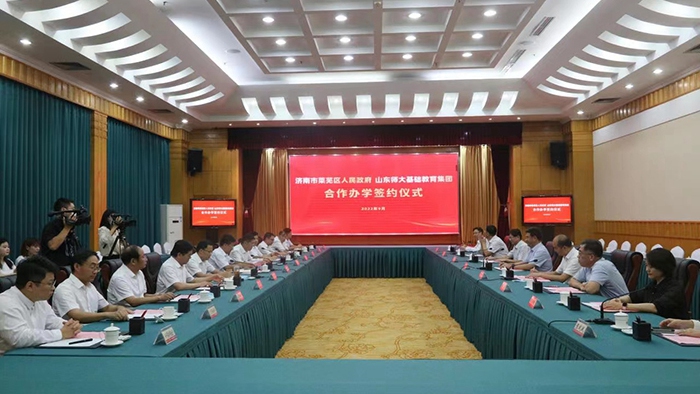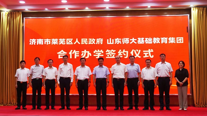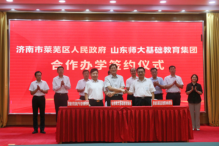 9月7日,山东师大基础教育集团与莱芜区人民政府举行合作办学签约仪式。山东师范大学党委副书记、校长曾庆良;莱芜区委副书记、区长李光辉,区委常委、宣传部部长、区委教育工委书记王宁,副区长张立军;济南市教育局党组成员、副局长刘绍辉出席活动。山东师范大学校长办公室、对外合作发展办公室、基础教育集团,莱芜区政府办公室、教育和体育局,济南市兴宇房地产开发有限公司负责同志参加活动。