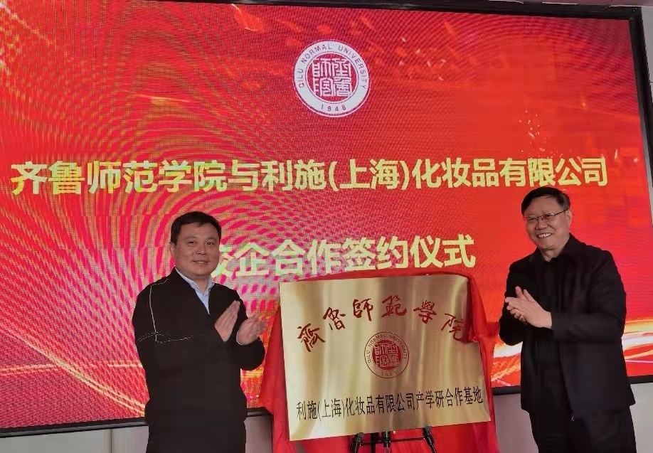 最后,齐鲁师范学院与利施(上海)化妆品有限公司产学研合作基地正式揭牌。林松柏为王勇颁发齐鲁师范学院客座教授的聘书。