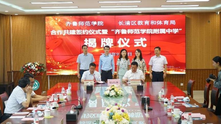 9月9日,在教师节来临之际,为进一步赓续教育初心,牢记师范使命,发挥学校服务基础教育的特色和传统,齐鲁师范学院与长清区教育和体育局在长清中学举行合作共建签约暨“齐鲁师范学院附属中学”挂牌仪式。