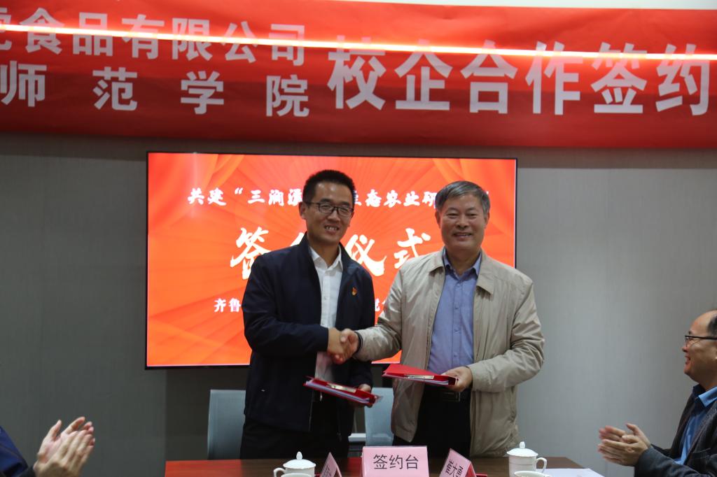 10月20日,齐鲁师范学院与济南源虎食品有限公司共建的“三涧溪源虎生态农业研究院”在章丘三涧溪顺利签约并揭牌。齐鲁师范学院党委书记林松柏,章丘区副区长赵淑新,济南源虎食品有限公司董事长李少清、总经理王元虎,齐鲁师范学院合作办公室主任刘勇出席仪式,齐鲁师范学院生命科学学院领导,章丘区政府、双山街道有关负责人,生命科学学院部分老师及济南源虎食品有限公司相关负责人参加活动。