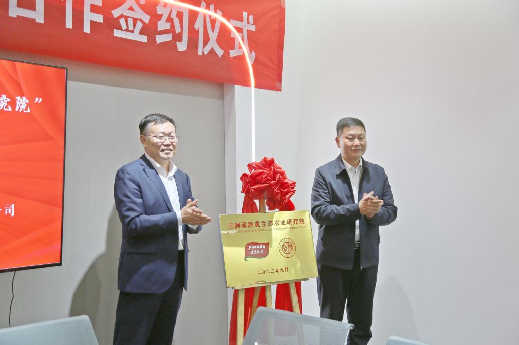 林松柏和赵淑新为三涧溪源虎生态农业研究院揭牌,生命科学学院院长李师鹏与王元虎签订合作协议,王元虎为贾建磊、宋勇强颁发科技副职聘书。