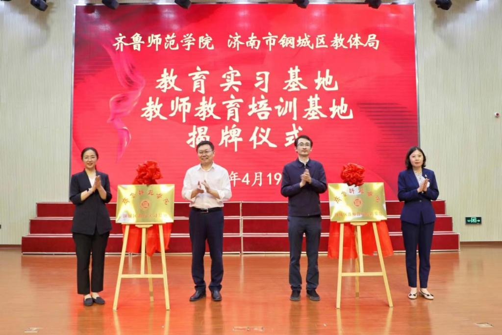 林松柏、靳玉波为“齐鲁师范学院钢城区教育实习基地”揭牌;孙正、孙春莹为“齐鲁师范学院钢城区教师教育培训基地”揭牌。