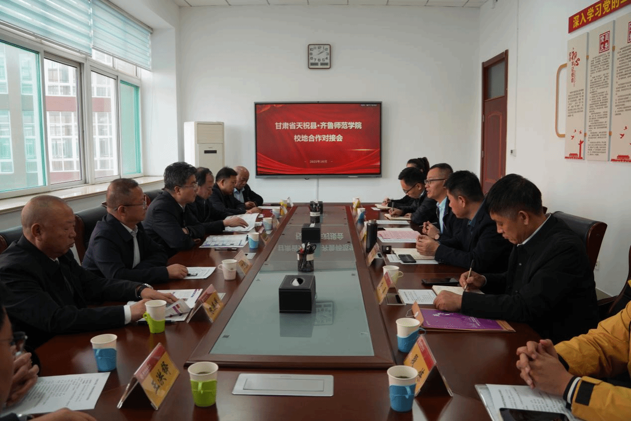 10月21日,甘肃省天祝县·齐鲁师范学院校地合作对接会在齐鲁师范学院第三会议室举行。天祝县政协党组书记、主席孟寿堂,党组成员、副主席张有宗、丁东龙,秘书长张臻,齐鲁师范学院党委委员、副校长孙洪兆出席会议。