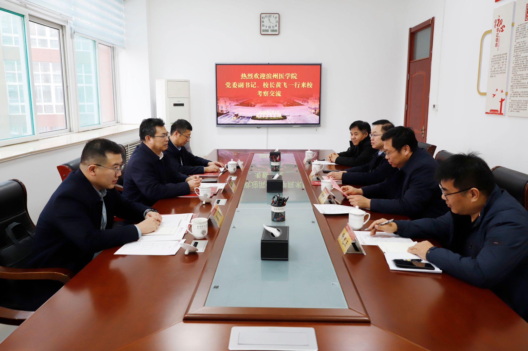2月4日下午,滨州医学院党委副书记、校长黄飞一行来我校考察交流。党委书记赵长林,党委副书记、校长郑秀文接待来访。双方围绕人才培养、学科建设、内部治理等方面举行座谈。